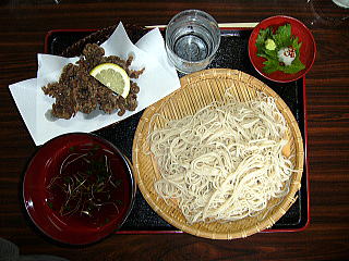 看板にもあるように「忠治そば」といって、馬肉の唐揚を添えたざるそばが名物だそうで、それを注文。 |