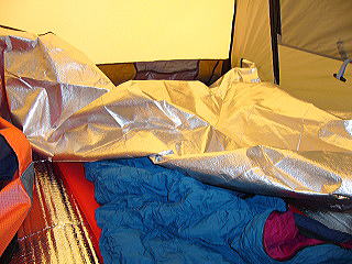 上にエマジェンシーブランケット、下には薄手のキャンプマットとアルミ蒸着の素材で上下を挟んでるので、蒸れはするもののかなり暖かい。 |