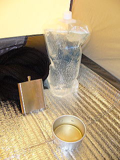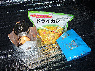 今夜のご飯は見ての通り。アルファ米はあんまし美味くないけど、ゼータクは言ってられません。