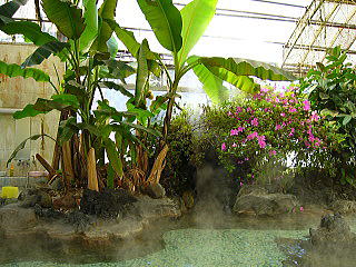 棕櫚と躑躅が同居する植え込みの中央付近から、熱い湯が流れ込んでいます。