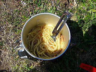しかし今日は野宿野郎として来たし、食材も燃料も時間も余ってるので、前の空地でパスタをこしらえました。