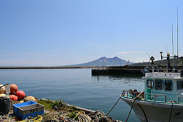 海に向かって長く伸びる裾野の優雅さと、荒々しい爆裂火口の対比が印象的。 |