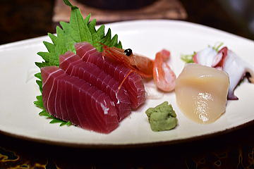 鮪・甘海老・帆立・蛸の刺身盛り合わせ。 |