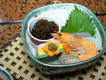 精進刺身・・・・・・ん?海老と帆立が入ってるやん。 |