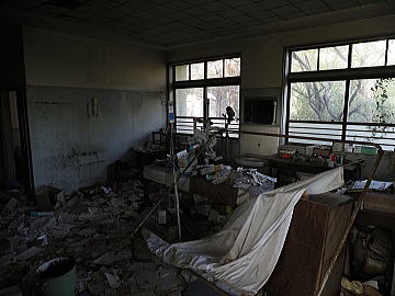 差し込む夕方の光に浮かび上がる、半ば破壊され、半ば自然崩壊した調度類。 |